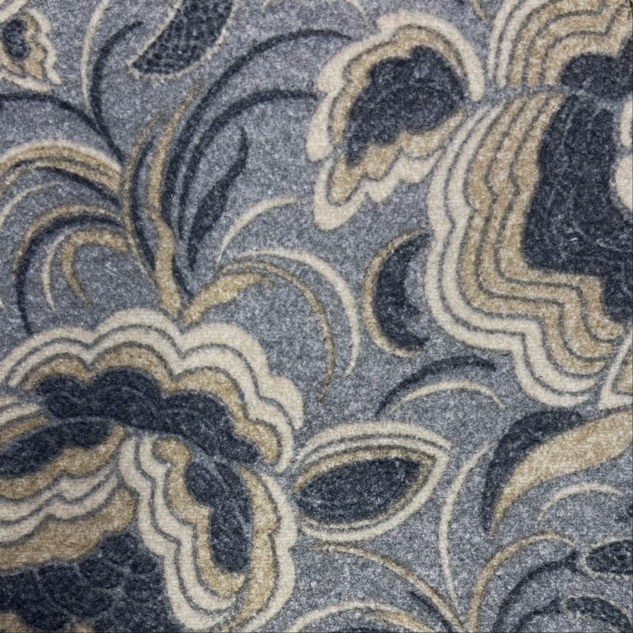 La manica, ampia ma controllata, è impreziosita da una martingala che riprende il motivo a goccia, chiusa su se stessa da un bottone d’archivio: un gesto sartoriale che regola il fondo manica con armonia e carattere.