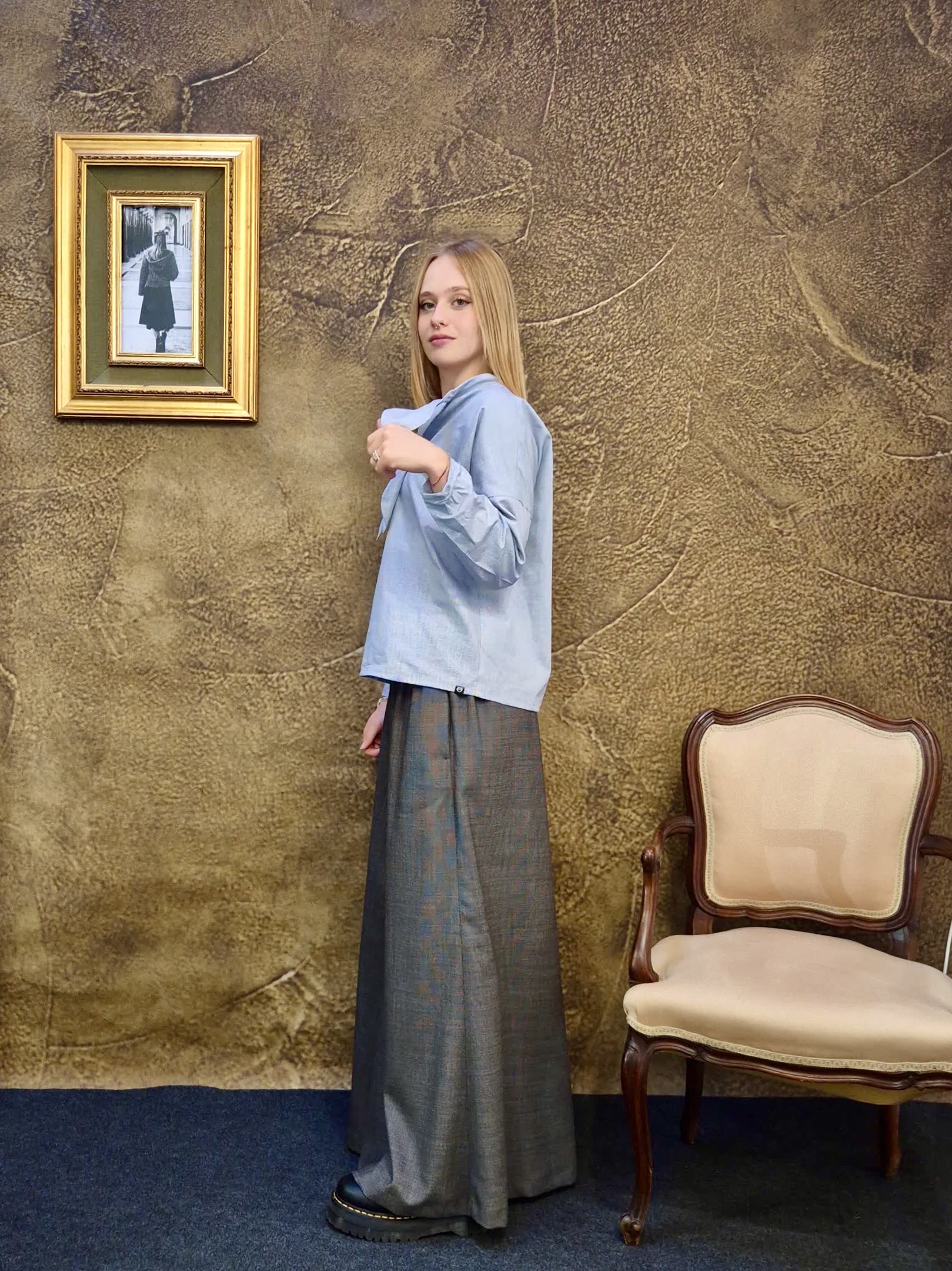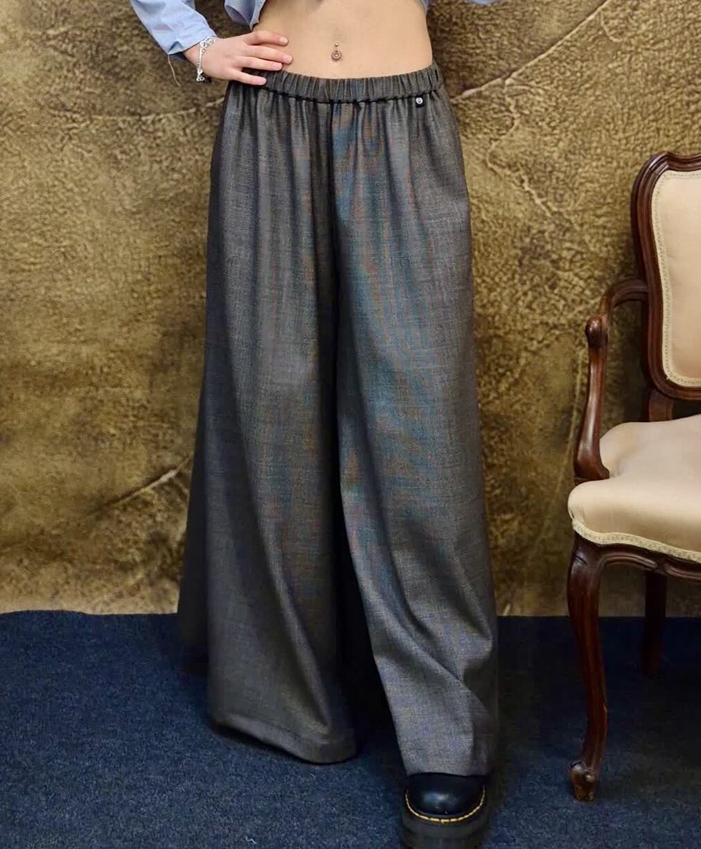Pantalone ampio con elastico in vita. Linea fluida e drappeggiata, effetto gonna. Realizzato in lane morbide o flanelle compatte per garantire movimento e struttura senza volume eccessivo.
