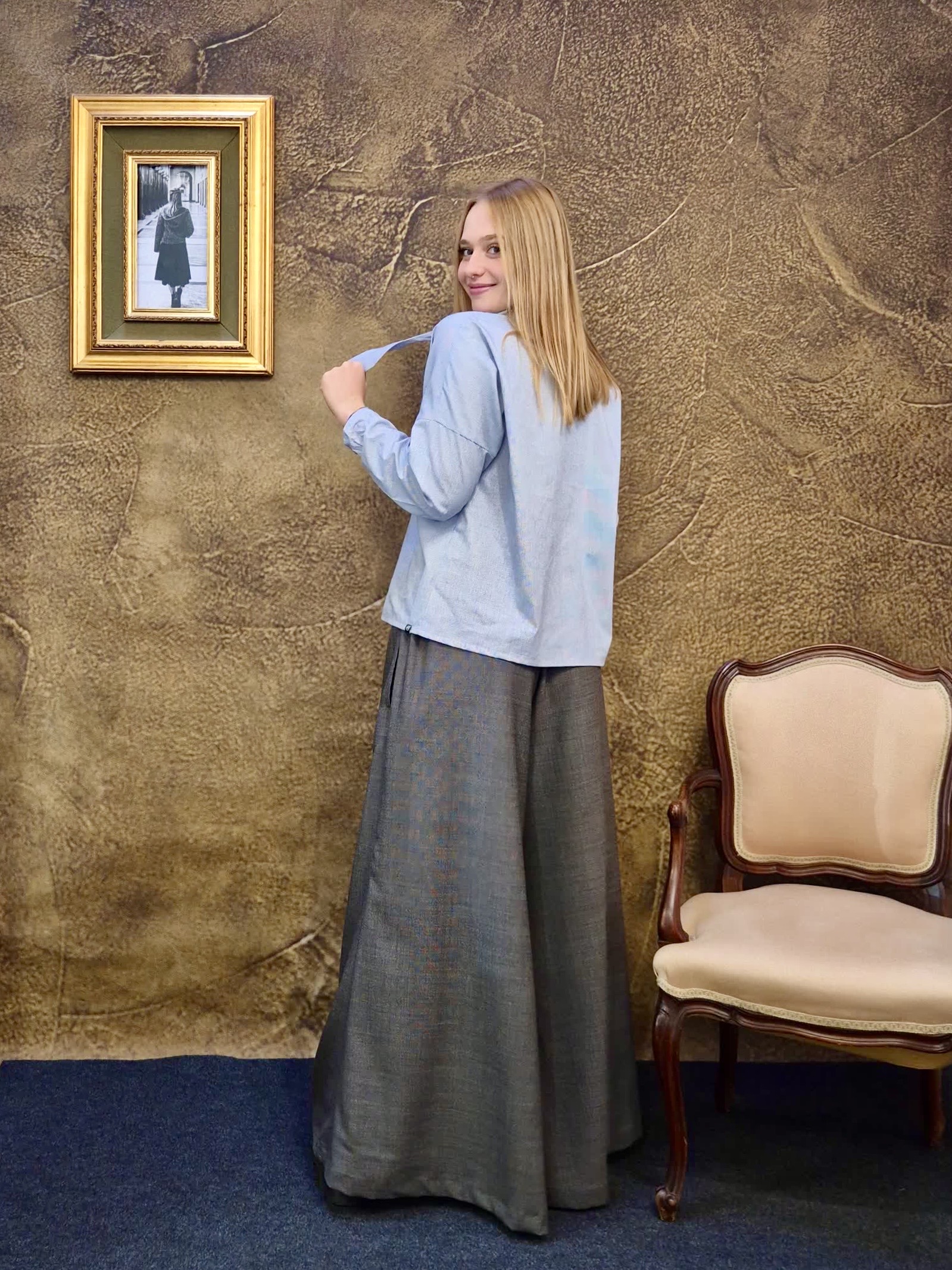 Il Pantalone Vento nasce dal desiderio di unire comfort e presenza scenica, equilibrio tra struttura e leggerezza.